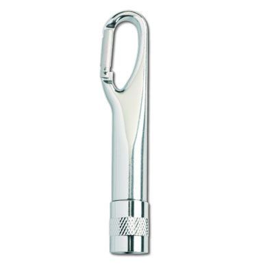 Aluminium white LED light with carabiner. 5xLR41 cell batteries included.