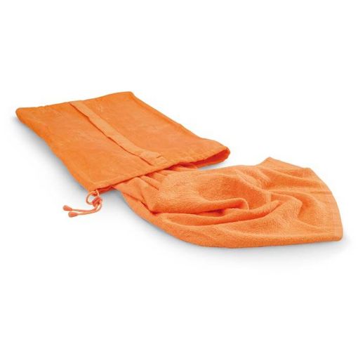 Beach towel with bag. 100% cotton. The towel can be folded inside the cotton bag which can also be used as a duffle bag.