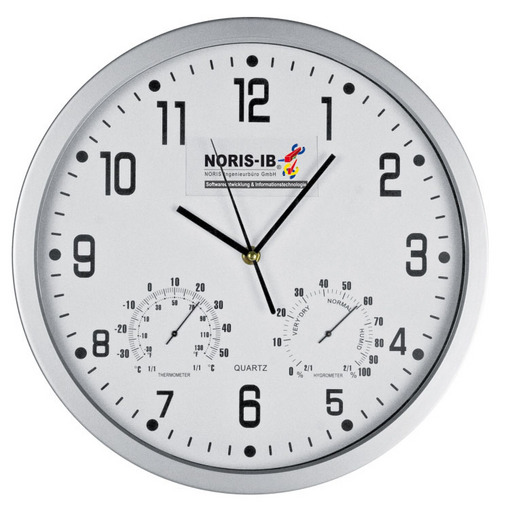 Suur shikk seinakell termomeetri ja hügromeetriga, Logo paigutuseks spetsiaalne plaat.