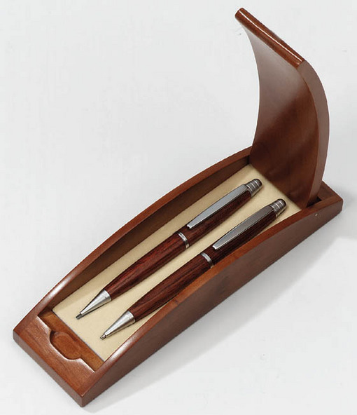 Huvitava disainiga puidust karbis on puidu ja metalli kombinatsioonis mehhaaniline harilik pliiats ja pastapliiats
