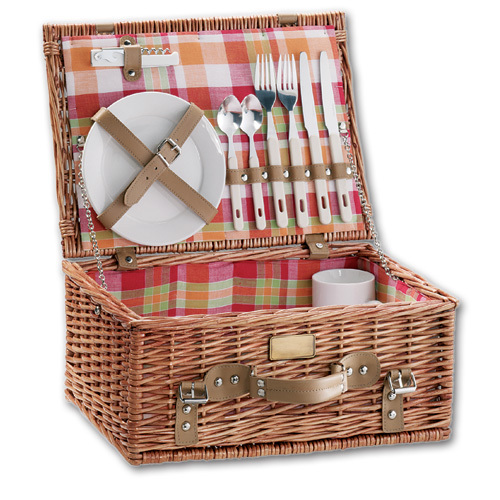 Piknikukorv kahele, keraamilised taldrikud ja kruusid, noad-kahvlid-lusikad ja avaja