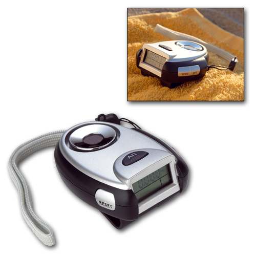 UV-meeter ja pedomeeter. Mõõdab päikese UV indeksit, näitab temperatuuri (°C/F), loeb samme, arvutab kalorite kadu ja distantsi (miilid/kilomeetrid). Kaelapael, 2 nööppatareid kaasas
