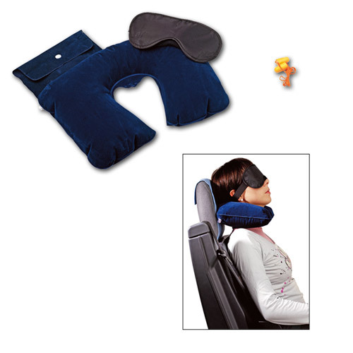 Täispuhutav reisipadi, uneprillid ja kõrvasulgurid sametkotikeses.