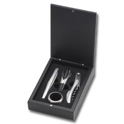 Soliidses musta värvi puidust karbis on korgitser, nuga leiva ja juustu lõikamiseks, kork ja tilgapüüdja.