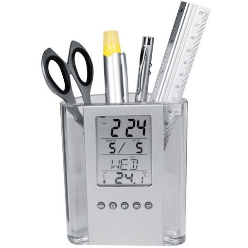 Läbipaistvast akrüülist pliiatsitops kella, alarmi, temperatuuri, kuupäeva ja nädalapäevaga.