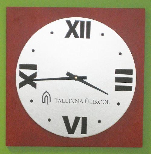 Ilus neljakandiline rooma numbritega kell, taus punast värvi, numbrilaud hõbedane