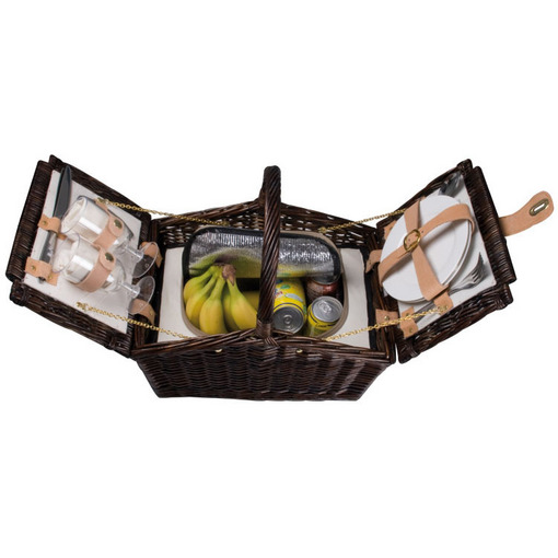 Piknikukorv 4-le, portselantaldrikud, plastklaasid, terasest noad-kahvlid, avaja. Mahukas jahutuskamber.