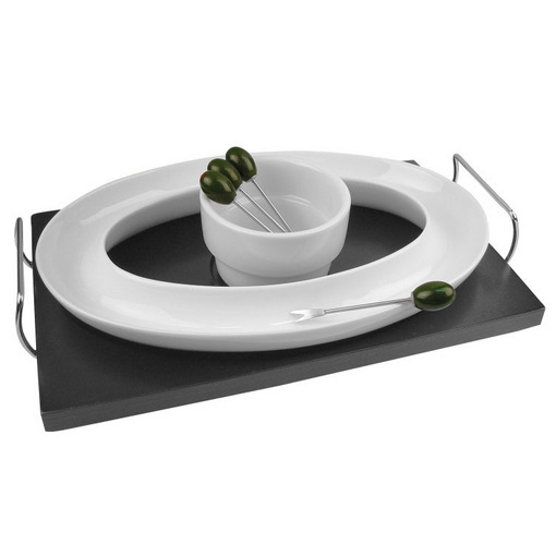Portsellanist oliivide alus mustal puidust kandikul ja oliivikahvlid 4 tk