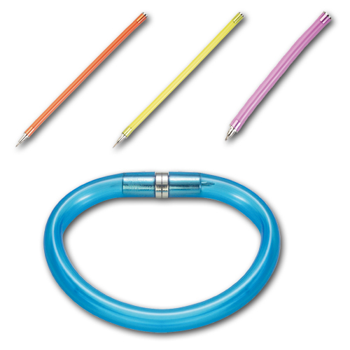 Painduv plastikust pastapliiats, sinise sisuga. Kokku pandav käevõruks.