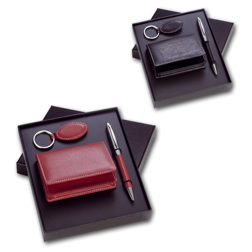Nahast kinkekomplekt sinise sisuga pastapliiatsi, võtmehoidja ja kaarditaskuga kinkekarbis
