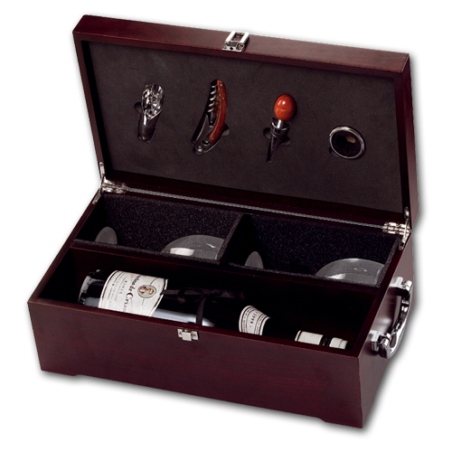 Luksuslik puidust veinikarp ühe pudeli jaoks kahe veiniklaasi ja tööriistadega.