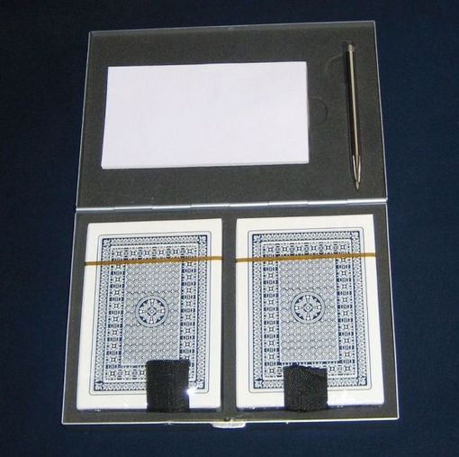 Mängukaardid märkmepaberi ja pastapliiatsiga metallkarbis.